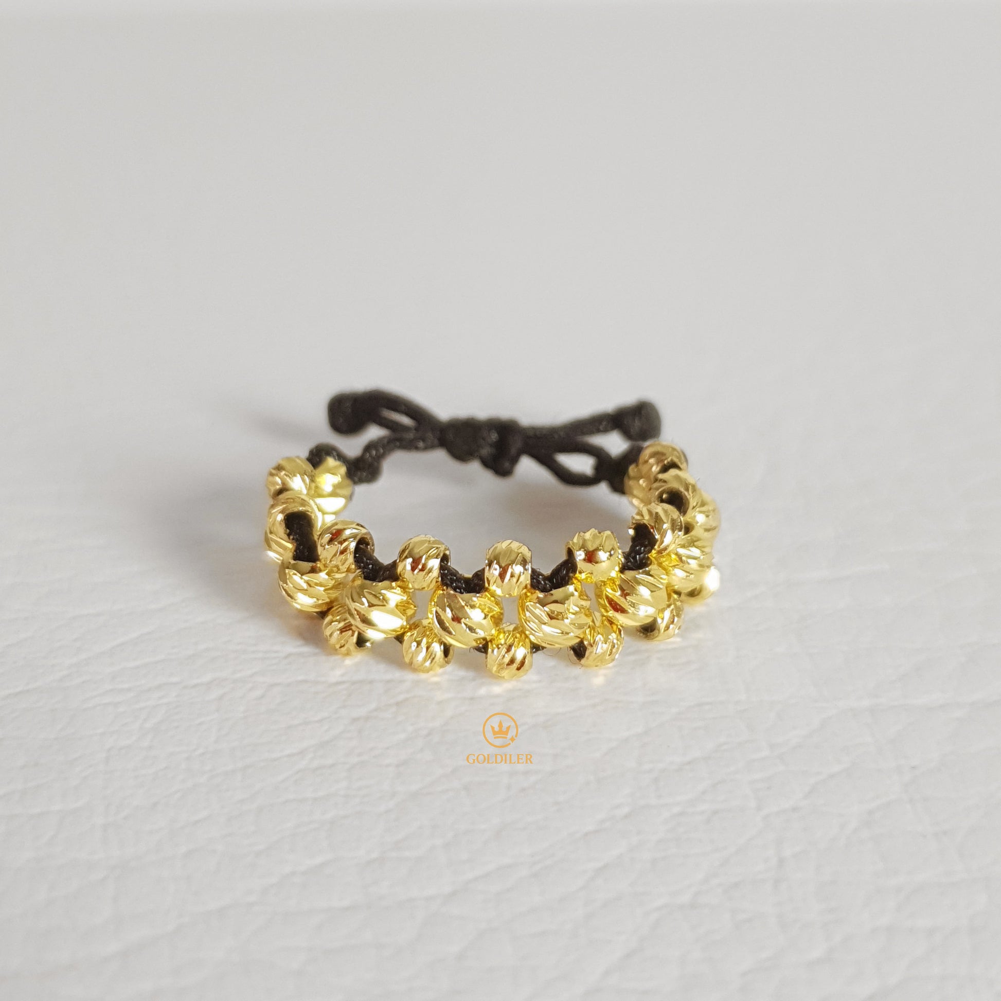 Un accesorio único que combina brillo y comodidad. Elaborado en oro laminado con balines diamantados entrelazados en tres carriles, este anillo ajustable destaca por su diseño artesanal y su acabado elegante. El contraste con el hilo negro realza el destello de cada balín, convirtiéndolo en una pieza moderna y versátil.