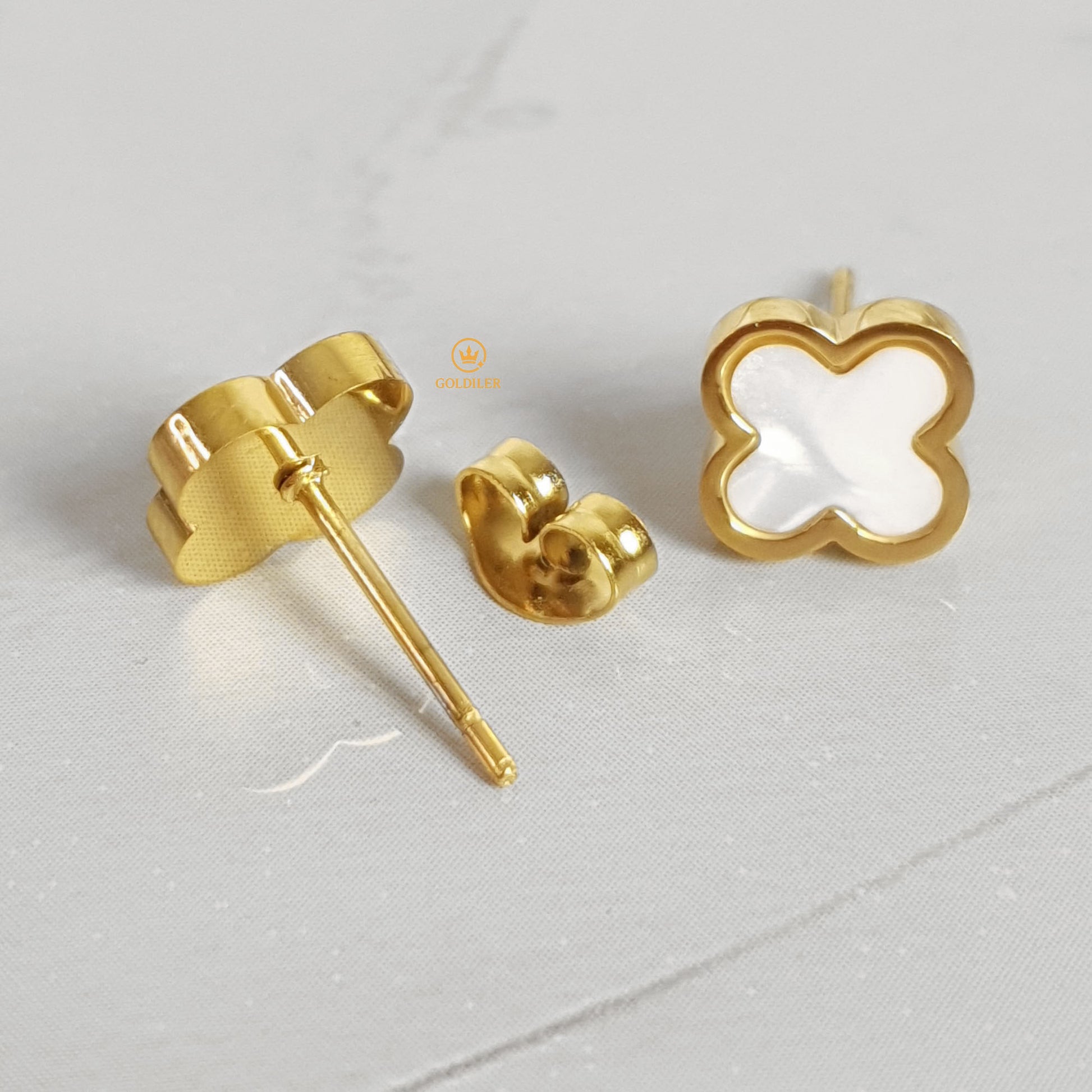 Un diseño que combina elegancia, brillo y buena suerte. Estos aretes, bañados en fino oro laminado, cuentan con un delicado trébol en madre perla blanca que refleja la luz con un resplandor único. Su forma sutil y sofisticada los convierte en la elección perfecta para elevar cualquier look, desde lo casual hasta lo más elegante.