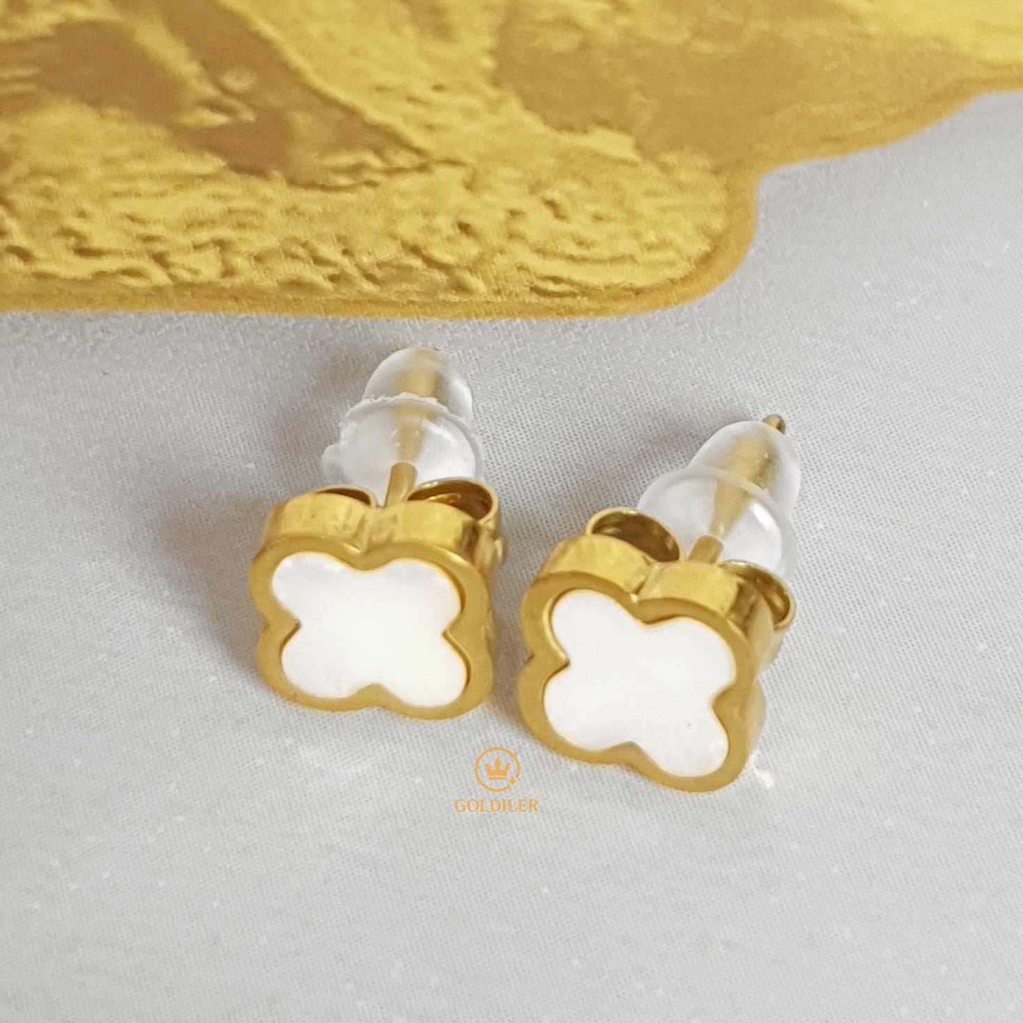 El clásico trébol de la suerte ahora en una versión más impactante. Estos aretes trébol en oro laminado, con acabado blanco elegante y con tamaño un poco mas grande que los aretes trébol blanco, son la combinación perfecta entre delicadeza y protagonismo.