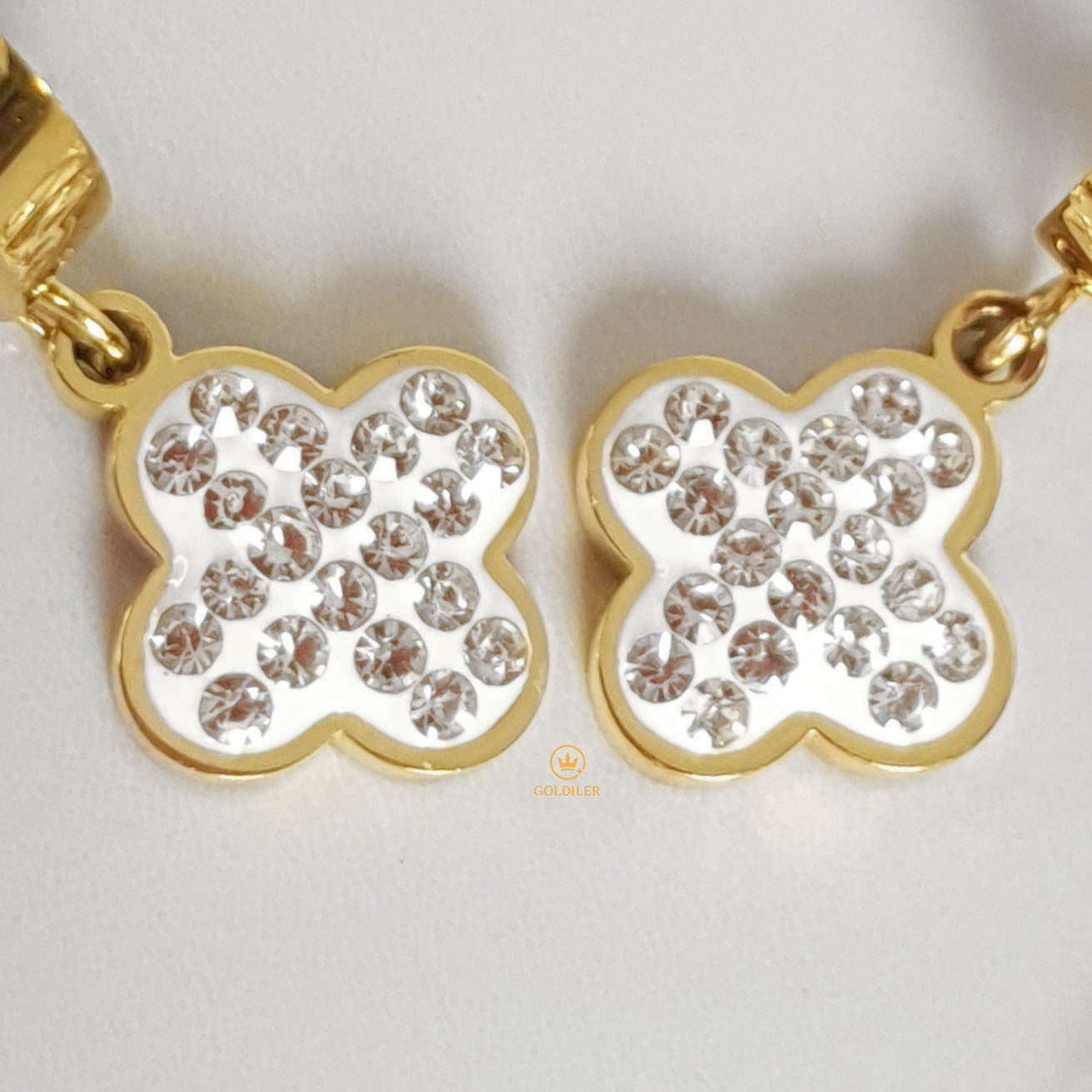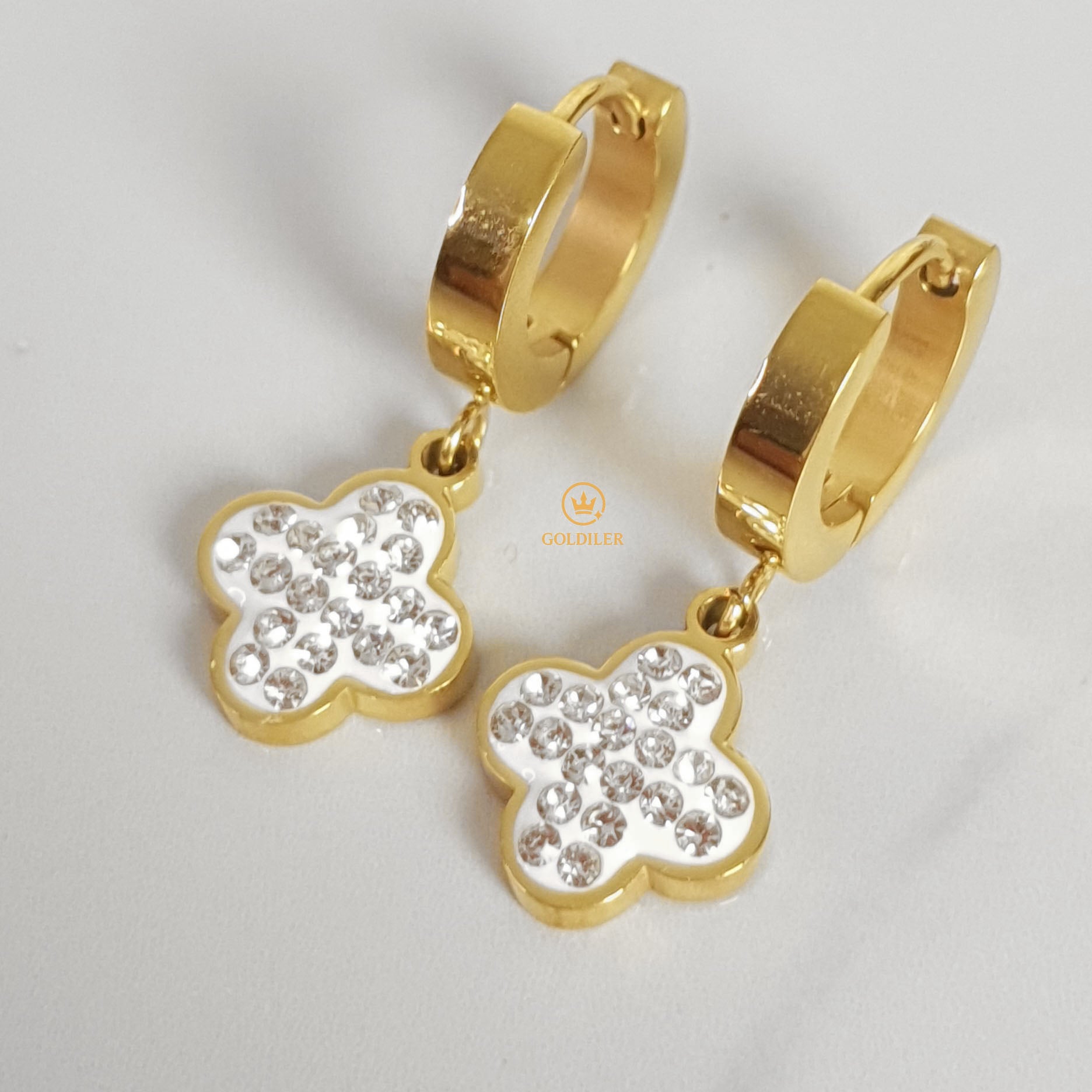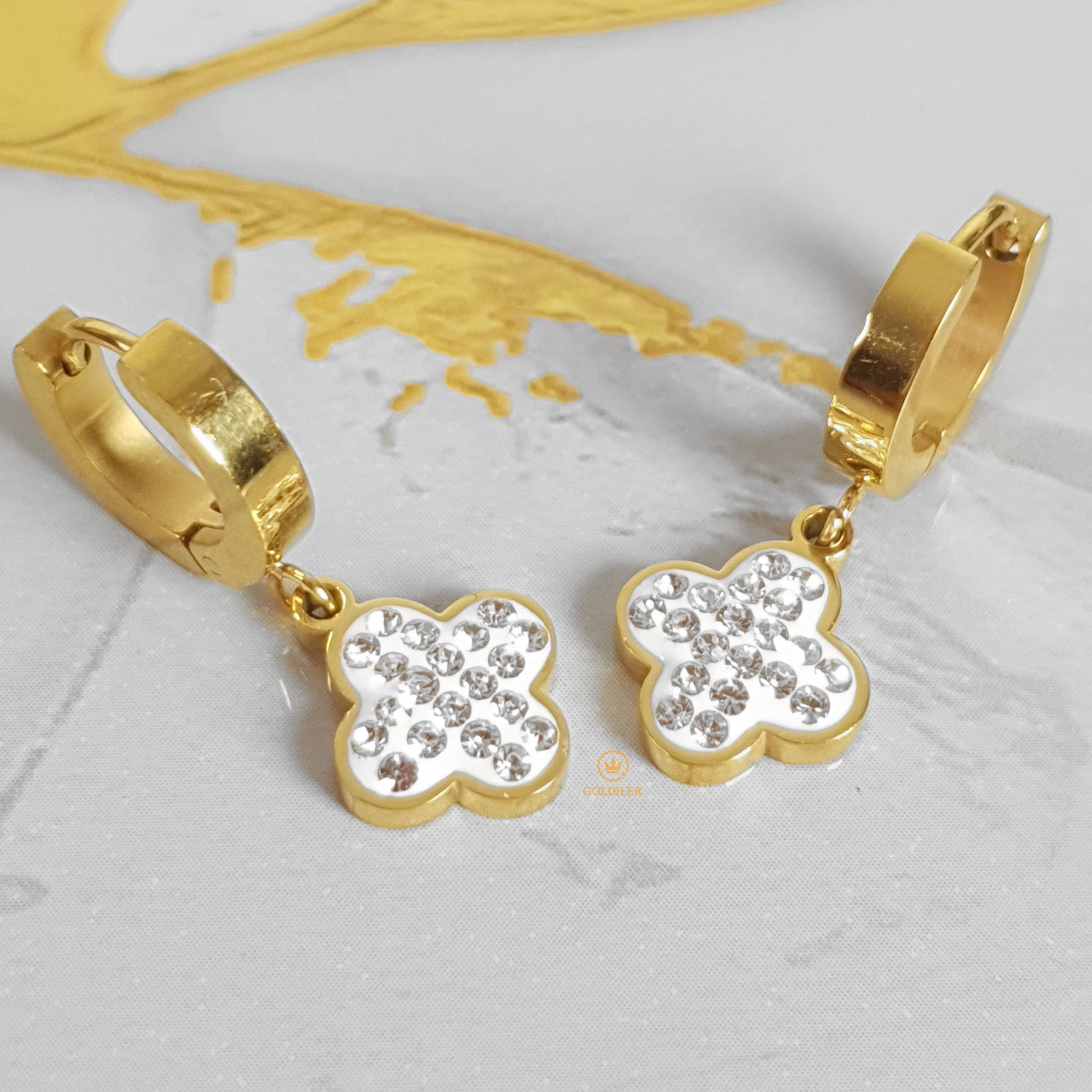 Estas candongas en forma de trébol están bañados en un deslumbrante oro laminado y realzados con brillantes circonias que capturan cada rayo de luz, creando un efecto radiante y sofisticado. Su diseño combina la delicadeza del trébol, símbolo de suerte y prosperidad, con el brillo atemporal de las piedras que evocan la pureza de un diamante.