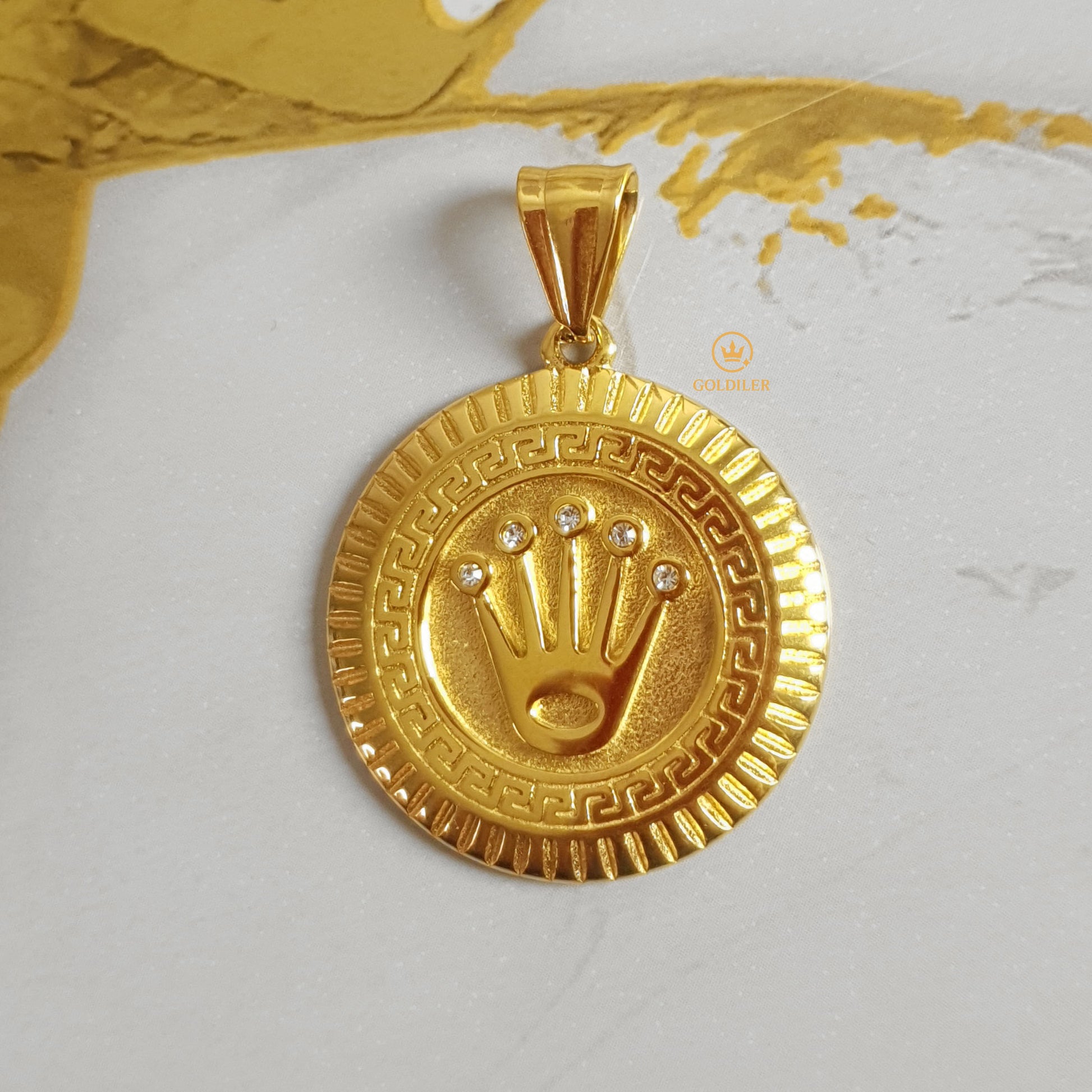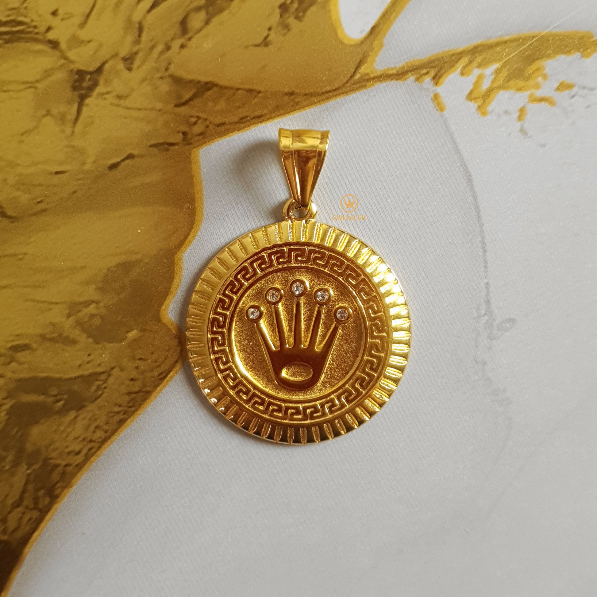Imponente, refinado y con un diseño que habla por sí solo. Este dije inspirado en la emblemática corona Rolex combina el brillo del oro laminado con detalles en piedras que capturan miradas. Ideal para quienes viven con clase y estilo.