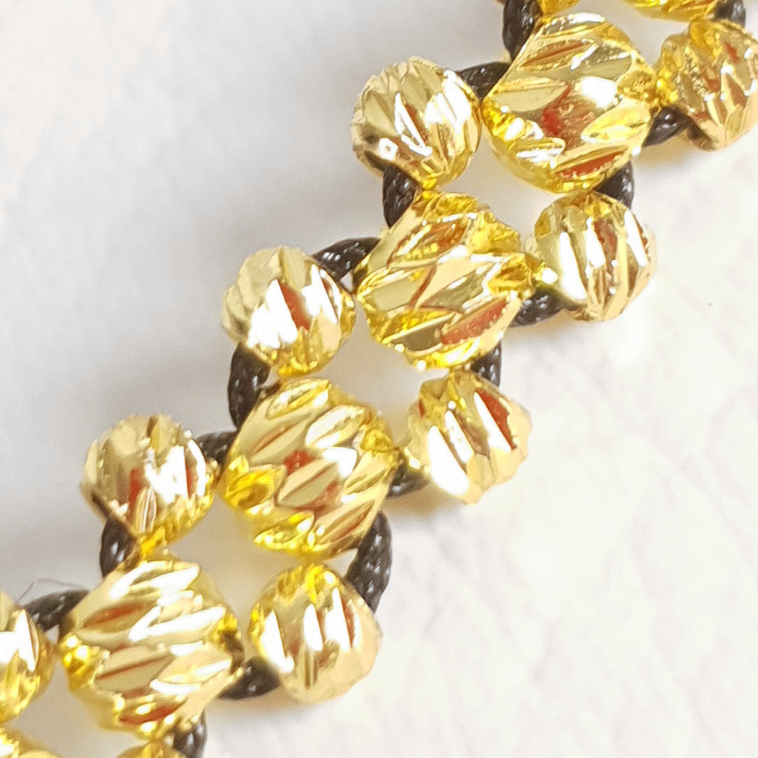 Un detalle que eleva cualquier look. Su diseño de tres carriles con balines diamantados en oro laminado refleja un brillo elegante y moderno. El tejido en hilo negro aporta contraste y hace que cada balín resalte con más fuerza. Perfecta para uso diario, gracias a su ajuste práctico y cómodo.