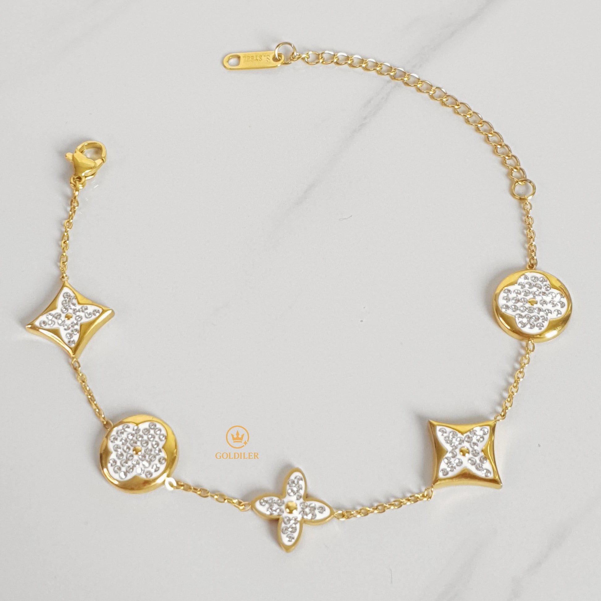 Un diseño lleno de significado y estilo. Este pulso en oro laminado combina la fuerza del trébol, símbolo de fortuna y prosperidad, con piedras blancas brillantes que aportan un resplandor único y sofisticado.